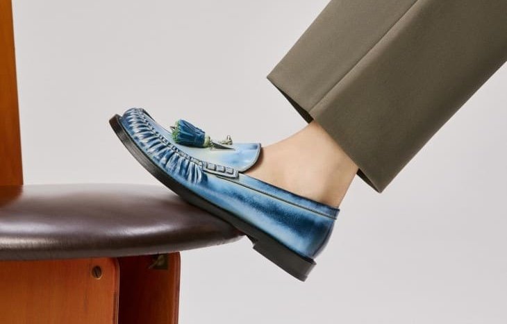 El mocasín Orlando disponible en un ceruleo que tiene más de atardecer mediterráneo que de azul corporativo es quizás la pieza que mejor ilustra este momento. Su doble tassel cosido a mano y rematado con la punta metálica característica de la Maison no es ornamento gratuito: es un guiño al control técnico del bailarín, a esa idea de que cada detalle existe con propósito y cada movimiento tiene consecuencias. El cuero cepillado aporta una textura que pide ser notada de cerca, no desde la distancia.